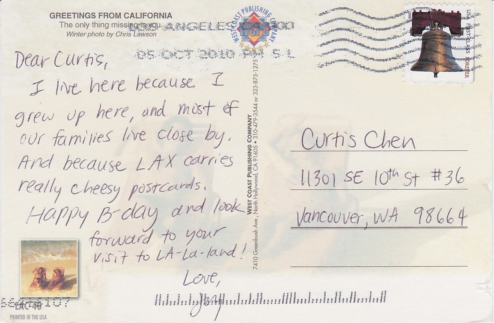 37postcards family Postcard #17 by Curtis Chen October 8, 2010 From my younger sister, whose offspring I will meet next week. About Author Curtis Chen I am not an aardvark. See author's posts