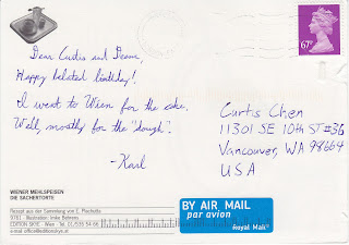 Thanks to Karl for taking time out of his busy travel schedule to send this postcard and the souvenir care package (not pictured) from Bletchley Park, which he visited with Lisa.