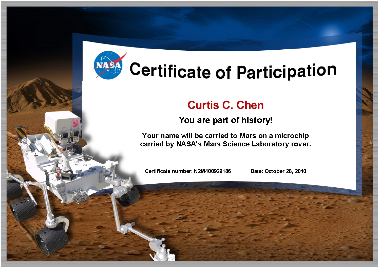 geeky sci/tech space Mars Stowaway by Curtis Chen October 28, 2010 My tax dollars at work: You, too, can send your name to Mars! About Author Curtis Chen I am not an aardvark. See author's posts
