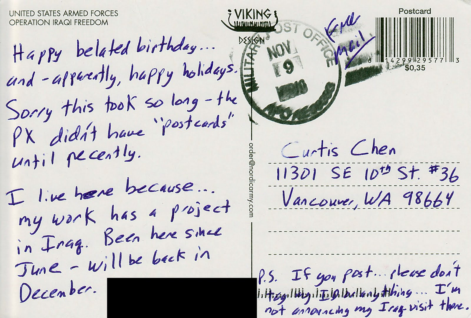 37postcards abroad Postcard #57 by Curtis Chen January 14, 2011 A missive from our mysterious friend abroad–let’s call him “Jake Gyllenhaal”–which took a full two months to travel from Iraq to Portland. About Author Curtis Chen I am not an aardvark. See author's posts