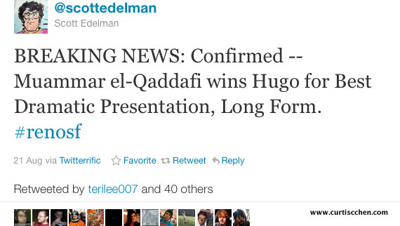On Monday, DeeAnn and I returned home from our road trip to Renovation, the 69th World Science Fiction Convention. This was the first Worldcon we’d attended since Denvention in 2008, and all the new friends and connections we’ve made in the intervening three years really added to the experience.