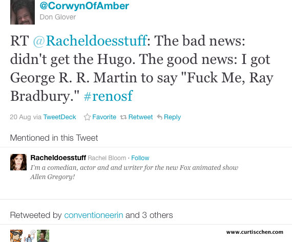 Speaking of George R. R. Martin, he was there, and a presenter at the Hugo Awards ceremony Saturday night. (Where Rachel Bloom and Seanan McGuire were robbed. Okay, end of rant.) You can watch the video online; if nothing else, skip to 1hr:31min for “The Garcia Moment.”