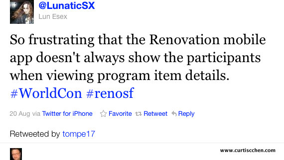 We probably spent at least as much time hanging out with people as we did in panels. I’d been excited about the fact that there was an app for the convention schedule–imagine that, science fiction fans actually using technology–but it turned out to be buggy and unreliable, and by Sunday, DeeAnn and I had gone back to using our paper schedules.