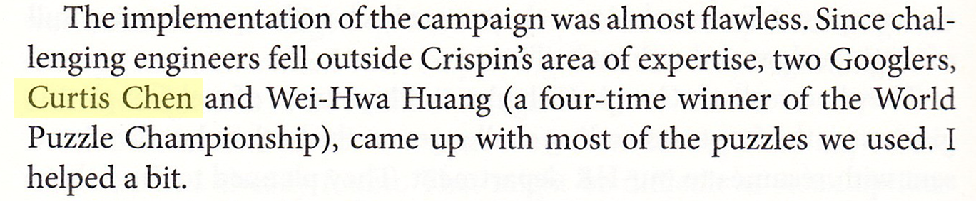 Anyway, I’m Feeling Lucky (an impulse checkout from my last trip to the public library) was a nice trip down memory lane–Doug’s employment at Google overlapped my time there by maybe two years, and I later worked with one of his successors in marketing, Dylan Casey, on another puzzle project. Given my personal connections to the subject matter, I’m not sure I can give an objective review of the book, but if you’ve ever wondered what life inside the Googleplex is like, this book will give you a taste. (Current Googler Larry Hosken is also a fan.)