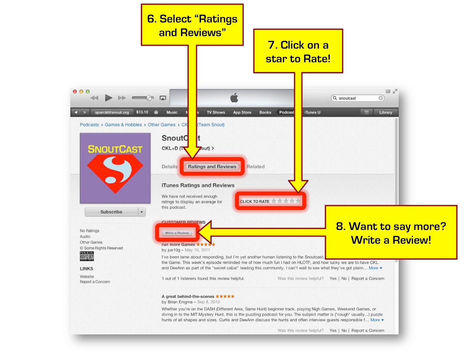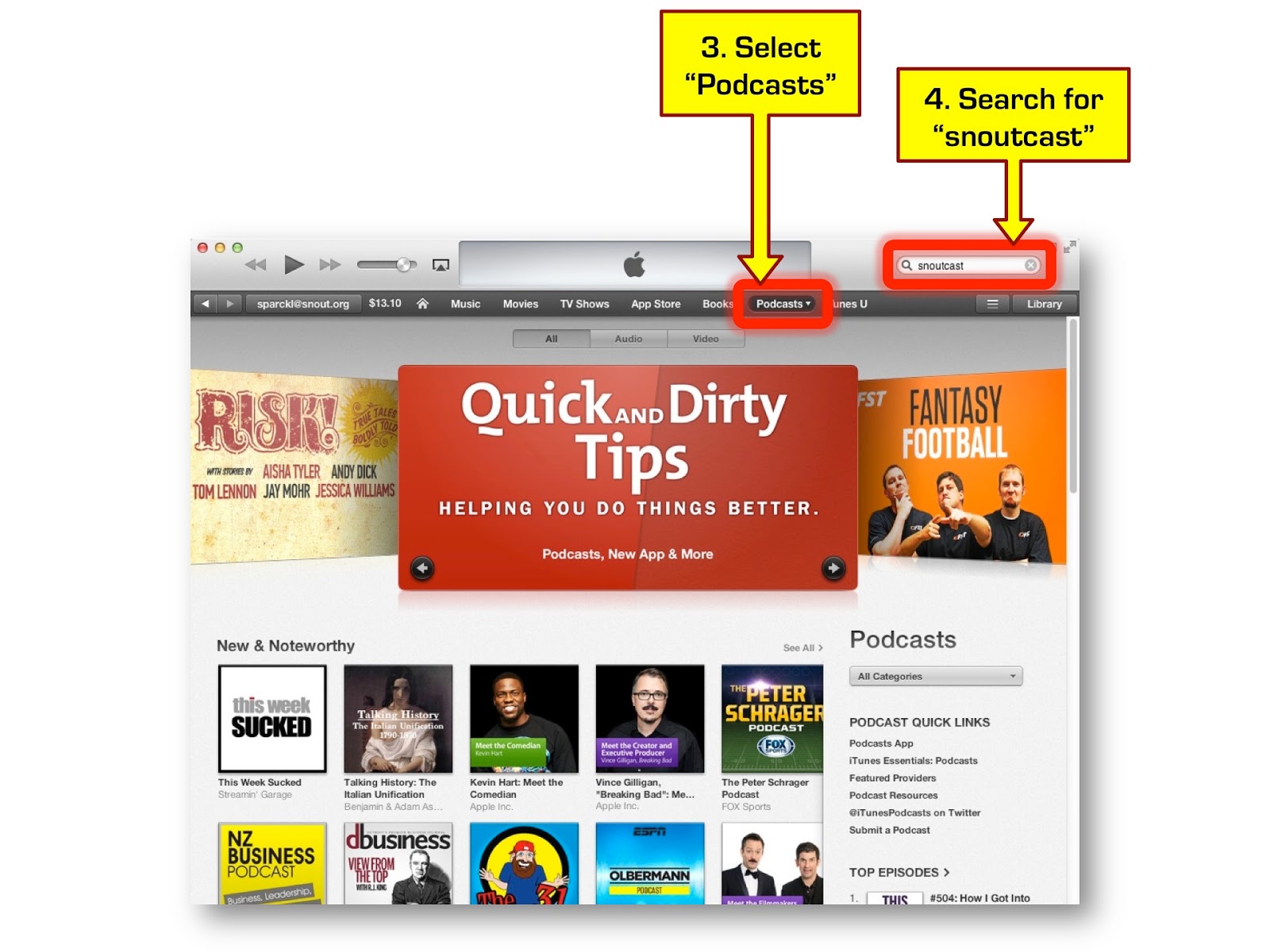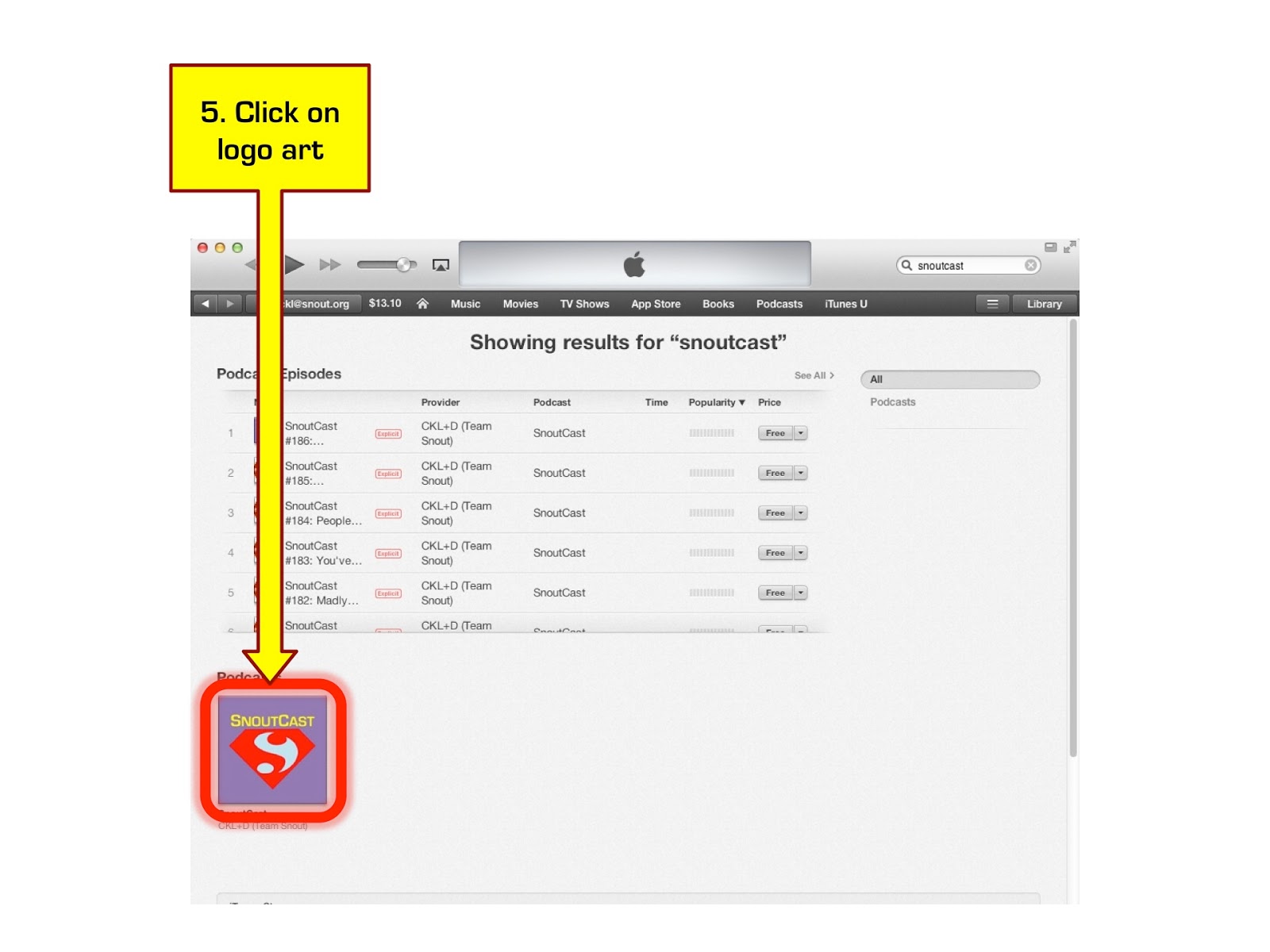 easy huh… next… go to PODCASTS and then type SNOUTCAST in the search box at the upper right corner of the window… look at the screenshot here if you have trouble finding it…