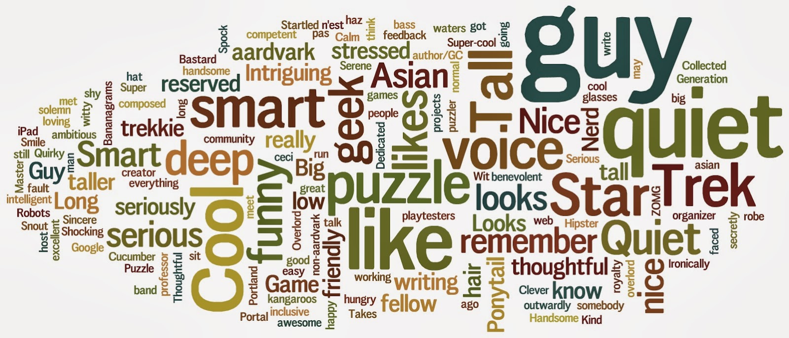 But honestly, it’s the entire collection of responses that is most striking. You can see some of that in the word cloud–I am clearly known far and wide for my love of Star Trek, and also for being tall and quiet. I guess I knew a lot of this already, but it’s nice to have actual data. You know, science and all that.