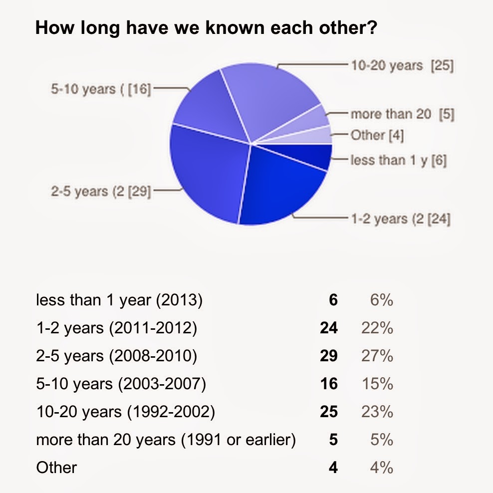 Not surprisingly, the biggest segment of responders was in the 2-5 year range (2008-2010). We moved to our current home area–Portland, Oregon–in late 2008, and about a year later started making a real effort to get out of the house and meet people. There’s another big cluster of responses in the 1-2 year range (2011-2012), which includes several Sea Monkeys and more awesome Portlanders.