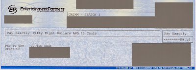 Shown above: the expurgated version of my paycheck from one day of background work on the upcoming Christmas episode of Grimm. Minimum wage, but not bad considering I sat around killing zombies for a few hours and then literally walked up and down a hallway half a dozen times.