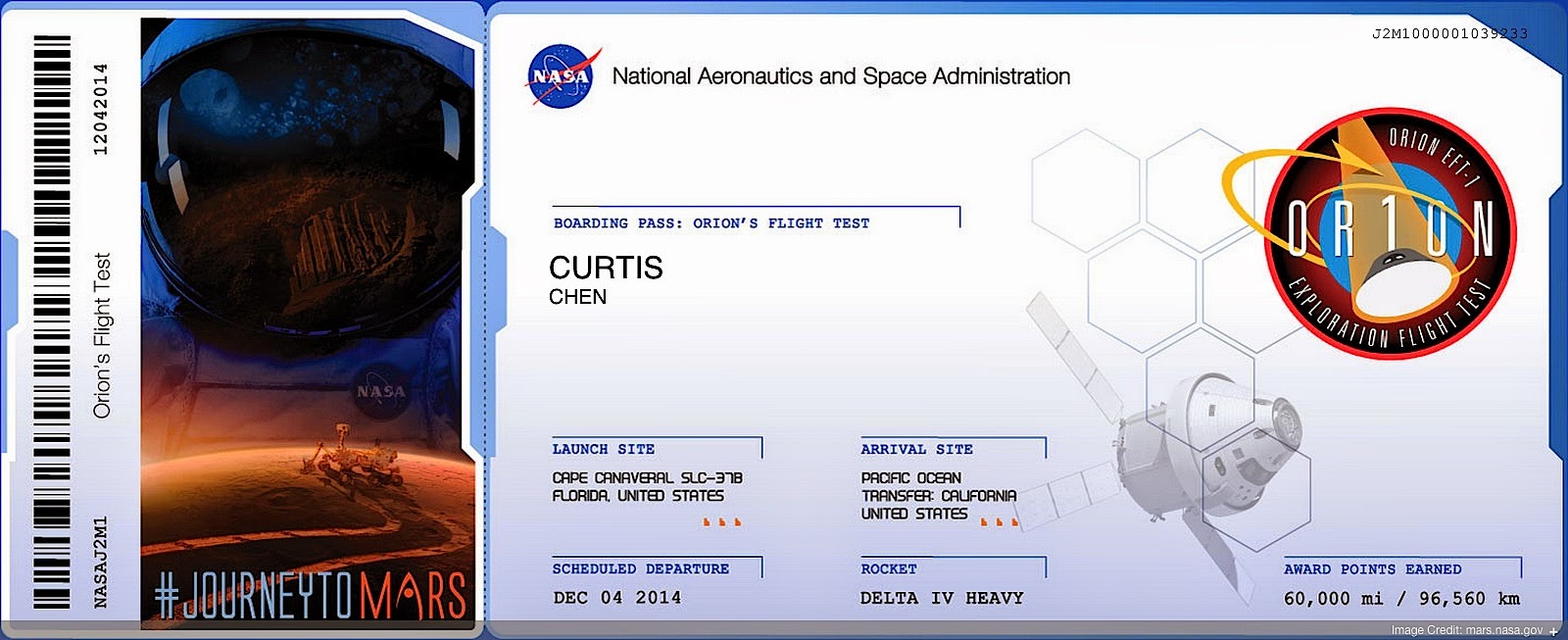 Last month, I submitted my name for one of NASA’s #JourneyToMars promotions—specifically, the Orion Test Flight “Boarding Pass” shown above, where they’ll etch your name into a computer chip that flies aboard the spacecraft.